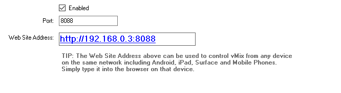 The vMix Web Controller is turned on by default and you can find the web site address to type in our device by clicking