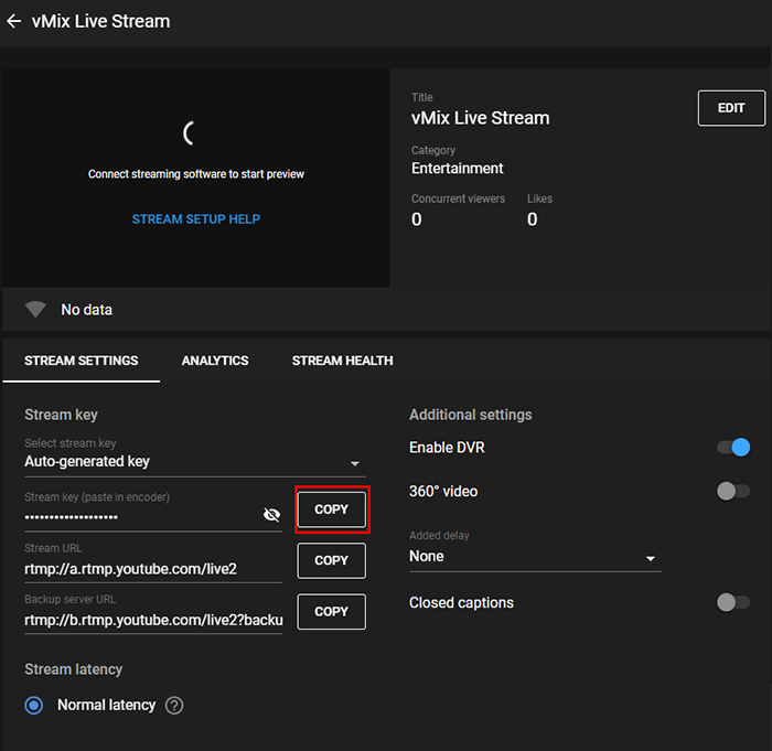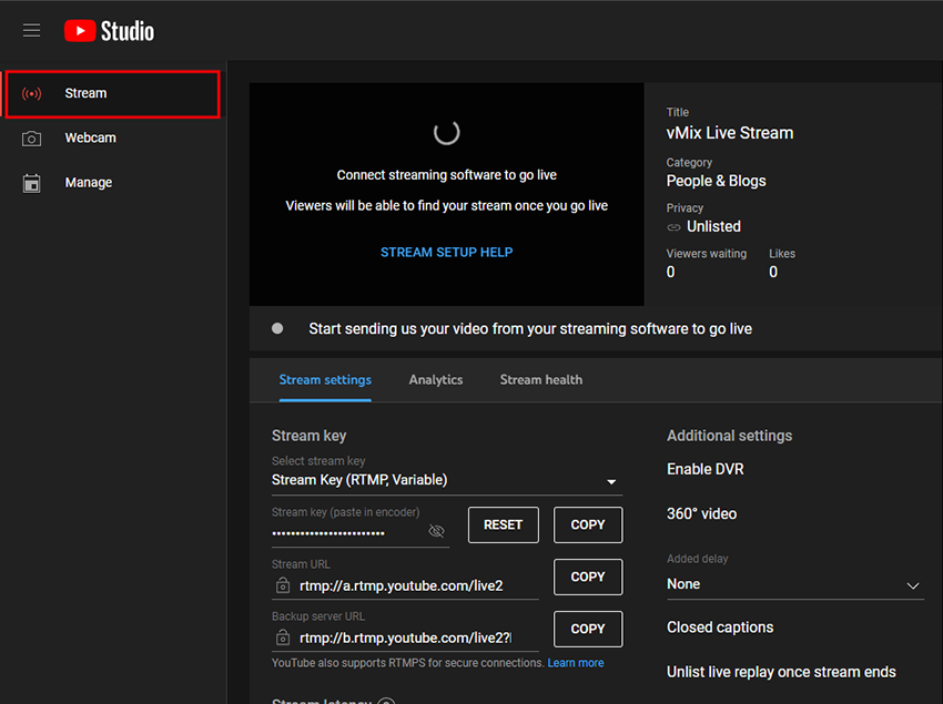 Select the Stream option from the left sidebar to setup a stream that will stream instantly. This means as soon as you start the live stream in vMix, YouTube will automatically go live as well.