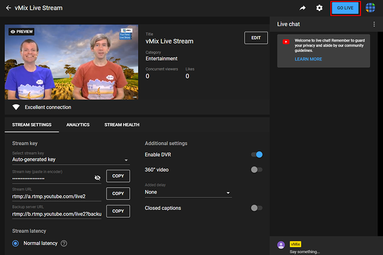 8. To begin the stream click the Stream button in your vMix window or open the Stream window and click Start to begin sending the stream to YouTube Live.